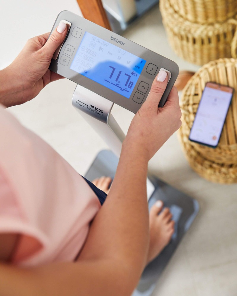 La nueva BF 1000 Super Precisión le ofrece justo lo que está buscando e incluso más. Gracias a sus 8 electrodos para manos y pies y a la medición cruzada especial no solo muestra el peso corporal, sino también la grasa corporal, la grasa visceral,el agua corporal, la masa muscular, la masa ósea y las necesidades calóricas.