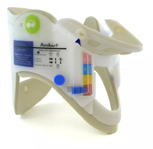 El Perfit ACE de Ambu es un collarín ajustable, rígido, de una sola pieza, ajustable con 16 graduaciones distintas (modelo adulto). También dispone del Ambu Perfit ACE Mini para tallas más pequeñas.