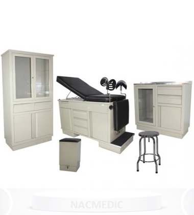 • Mesa de exploración modelo Hamilton con contacto para luz y sangrera con cajones centrales. (incluye pierneras).
