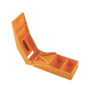 Pastillero 2 en 1. Almacena y corta pastillas, práctico diseño tipo prensa con compartimento de almacenamiento.