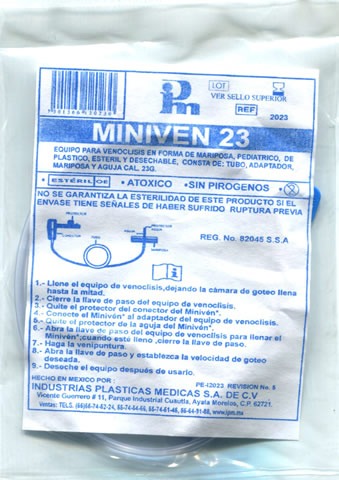 Equipo para venoclisis en forma de mariposa, pediatrico, de plástico, estéril y desechable, consta de tubo, adaptador, mariposa y aguja.