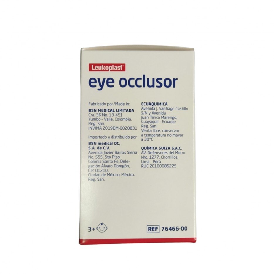 El oclusor ocular Leukoplast consiste en un sustrato no tejido de color carne, elástico en cruz, químicamente adherido a base de poliéster que está recubierto poroso en un lado con un adhesivo acrílico.