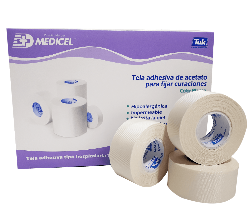 Cinta de tela de acetato suave y flexible, con adhesivo de hule-resina que se adhiere firmemente a la piel. Soporta la humedad de la piel, así como la humedad del baño. Esta cinta, puede esterilizarse con el proceso de óxido de etileno.
